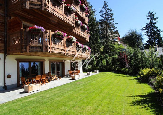 This stunning apartment on the ground floor has a large private garden (57m2) with superb views and a total of 160m2 of living space and three bedrooms each with en-suite bath/shower room. A light and contemporary living room with a fireplace and access to the south-facing garden, a guest WC and a fully fitted kitchen with all amenities complete this ultimate luxury apartment. The resident of this apartment benefit from the outstanding facilities available including a SPA, a counter-current swimming pool, a fitness room, a sauna and Hamman, two Jacuzzi's, a massage room, a bar and restaurant. Further, the residents have the use of a home cinema and a carnotzet (party room) for 30-40 people and a games room.