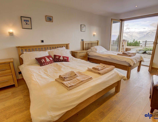 This creates a luxury and cozy lodge feel, a perfect harmony between comfort, tradition and volume and all modern conveniences. This property benefits from an absolute quietness and spacious living space. The idyllic terrace with a jacuzzi overlooks the Valley and allows breathtaking views looking at the sunset over the Rhone Valley. The ski bus is nearby to conveniently transport you to and from the slopes.