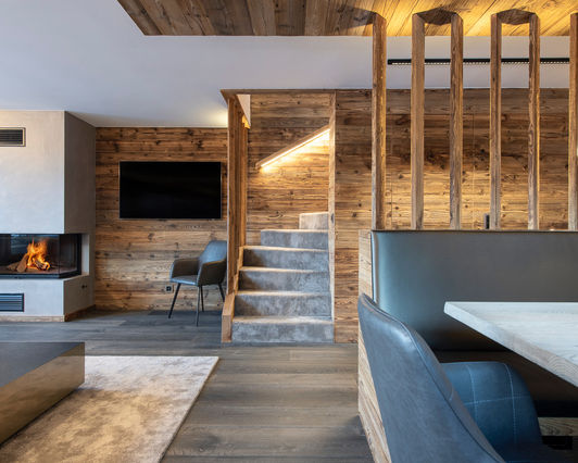 massif, with maximum sunshine hours. It is just a short walk from the Centre of Verbier, the central square, and all amenities. The apartment is built in oldwood and stone, with interior wooden panelling, materials that are a byword for sophistication.